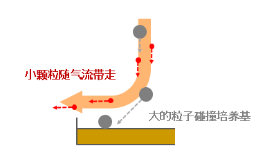 如下圖所示,活性粒子隨著氣流的流向改變,大的粒子會因?yàn)閼T性撞擊在培養(yǎng)基上,而小的顆粒會隨著氣流而帶走。因此并不是所有的浮游菌采樣器都能具備這樣的物理能力將盡可能小的粒子撞擊在培養(yǎng)皿上;然而,提高采樣空氣的流速有可能因?yàn)闄C(jī)械損傷或者打碎了細(xì)jun或微小真jun團(tuán)而引起粒子存活率的下降(見ISO14698-1附錄B)。